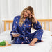 Enfilez ce pyjama en soie imprimé flamant rose pour un confort et une ambiance ludiques. Confectionné en pure soie de mûrier, ce deux-pièces à manches longues arbore un motif flamant rose ludique sur un fond bleu marine profond. Le haut boutonné et le pantalon à taille élastique offrent une coupe décontractée et élégante, idéale pour se détendre ou dormir dans un luxe absolu.