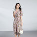 Romantique et raffinée, cette robe midi en soie présente un décolleté en V cache-cœur, de délicates manches bouffantes et une ceinture légèrement plissée qui flatte la silhouette. Elle est ornée d'un imprimé floral intégral couleur eau.