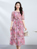 Cette robe présente une encolure ronde, un délicat pli sur le devant et des manches bouffantes souples pour une touche d'inspiration vintage. Une ceinture assortie ornée de pompons souligne la taille et apporte une finition raffinée. L'imprimé rose chiné lui confère un style frais et artistique, faisant de cette robe en soie une pièce à la fois séduisante et facile à assortir.